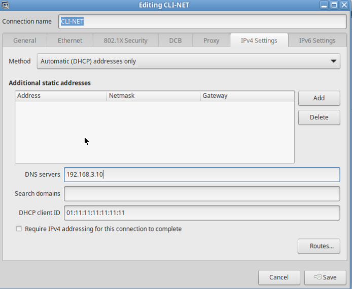 Укажите в качестве DNS сервера 192.168.3.10 (в Method обязательно укажите Automatic address only)
